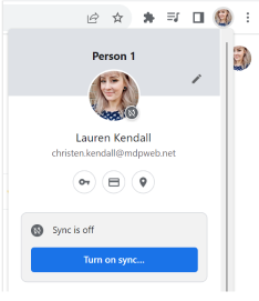 3. Once signed in, you'll see your account bubble (with your picture if you have one). Click on the bubble to make sure Sync is turned on. If it isn't, it'll look like this: