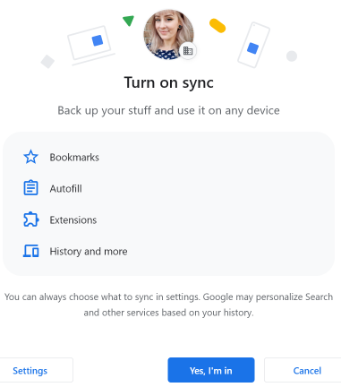 5. Click "Yes, I'm in" and your sync will be turned on! You should now see your bookmarks loaded below your address bar in the browser. If you don't, click the 3 dots in the upper right corner and navigate to Bookmarks > Show bookmarks bar. This should load any bookmarks you've saved in the past IF you saved them while sync turned on.