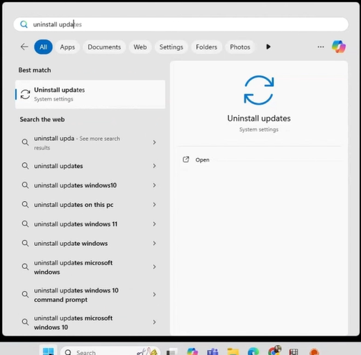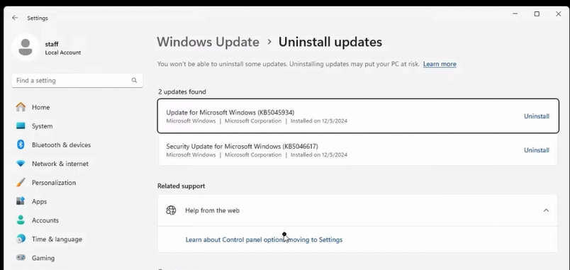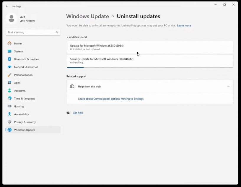 2. this page will load up, make sure it's the KB5045934 & KB5046617 updates, and uninstall both: