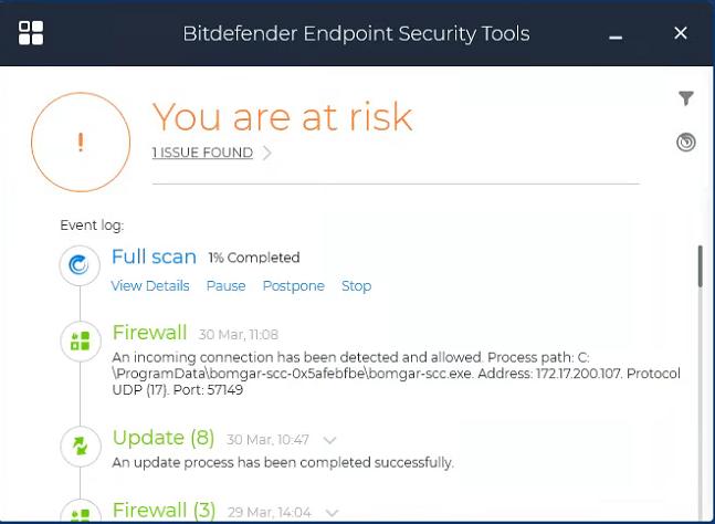Double-clicking on the icon will bring up a screen similar to what's seen below. If you see a "YOU ARE AT RISK" notification, it's most likely prompting for a full scan of the PC. You can click the 1 ISSUE FOUND notice to initiate that. This does not mean you have been infected. It's just good practice to run a manual scan every now and again.