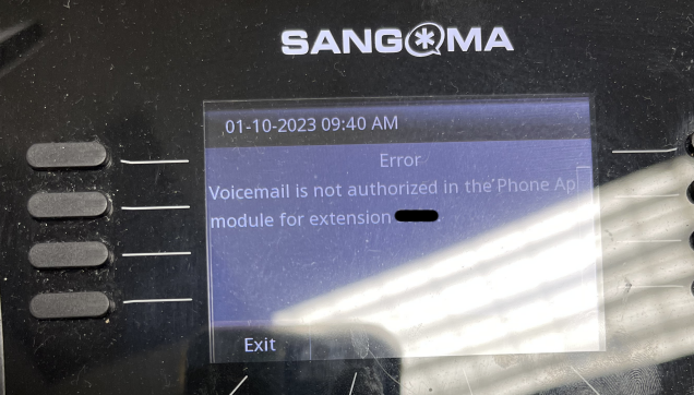 If you receive the message, "Voicemail is not authorized in the Phone App module for extension ____" when you press the VM button on a Sangoma phone, please put a ticket in with IT Operations. It is due to the button not being configured in the phone's webmin and IT will need to fix it for you. |