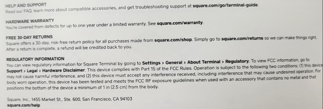 FAQ: https://squareup.com/help/us/en/article/6538-square-terminal-faq Troubleshooting: https://squareup.com/help/us/en/article/6537-square-terminal-troubleshooting Support search/contact: https://squareup.com/help/us/en/contact?panel=0489FBDE0A2F